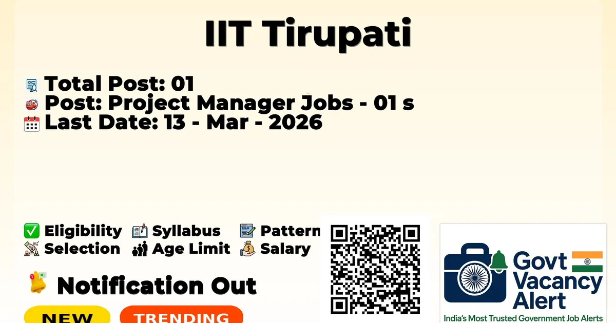 Indian Institute of Technology Tirupati (IIT Tirupati) has declared the official notification for 2026. To fill up the vacancies for Project Manager Jobs. Those candidates who have qualified in the M.E/ M.Tech, Post Graduationcan grab this chance and apply for the IIT Tirupati Recruitment 2026. Here we include the age limit, selection process, salary structure, education details, application fee, and how to apply for these posts.