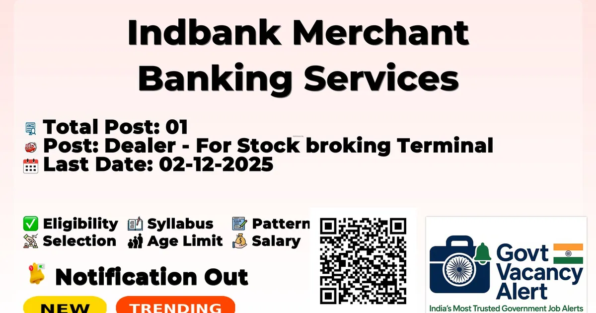 Company Name Indbank Merchant Banking Services (Indbank) Post Name Dealer - For Stock broking Terminal No of Posts 01 Compensation Rs. 4.20 lakhs p.a. Qualification Any Graduate Place of Posting Kanpur Age Limit 21 to 35 years Start Date for Apply 14-11-2025 Last Date for Apply 02-12-2025 Official Website indbankonline.com