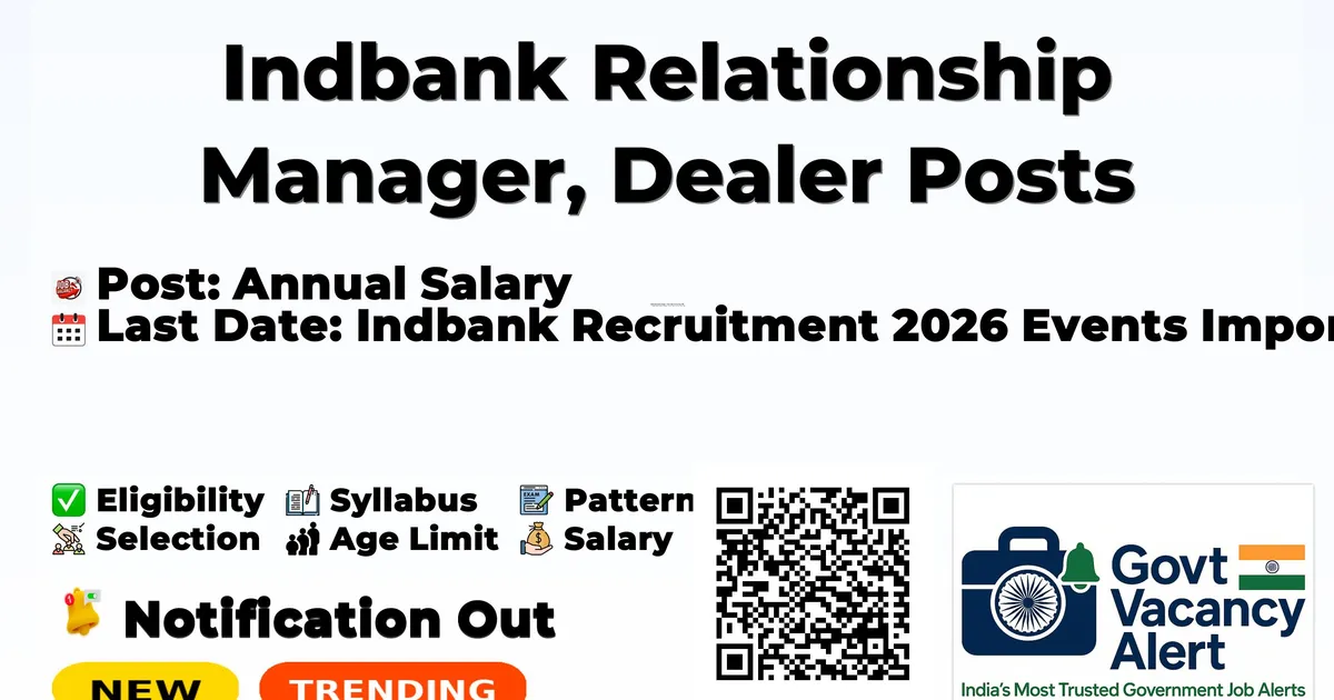 Particulars Details Recruitment Name Indbank Relationship Manager / Dealer Recruitment 2026 Department Indbank Merchant Banking Services Ltd Advertisement No. Adv/2026/04 Post Names Relationship Manager, Dealer (For Stock Broking Terminals) Total Vacancies 12 Posts Pay Scale Relationship Manager: Rs.4.00 to Rs.5.00 lakh p.a.; Dealer: Rs.4.20 lakh p.a. Essential Qualification MBA in Marketing/Finance (Relationship Manager); Graduation with NISM qualifications (Dealer) Age Limit Relationship Manager: 25–35 years; Dealer: 21–35 years (as on 01.01.2026) Application Mode Offline (Speed Post / Registered Post) Application Fee Not Mentioned Job Type Full Time Application Last Date 17 April 2026