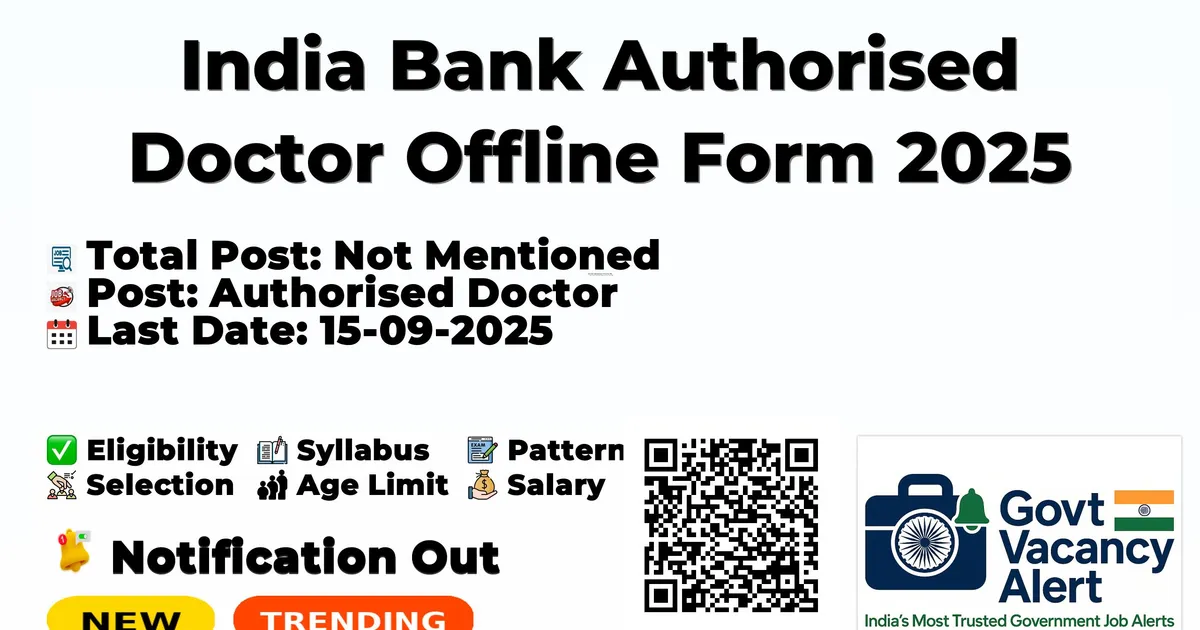 The India Bank Recruitment 2025 for posts of Authorised Doctor. Candidates with MBBS Can Apply Offline. The Offline application opens on 30-08-2025, and closes on 15-09-2025. The candidate shall apply Offline through India Bank website, indianbank.in.