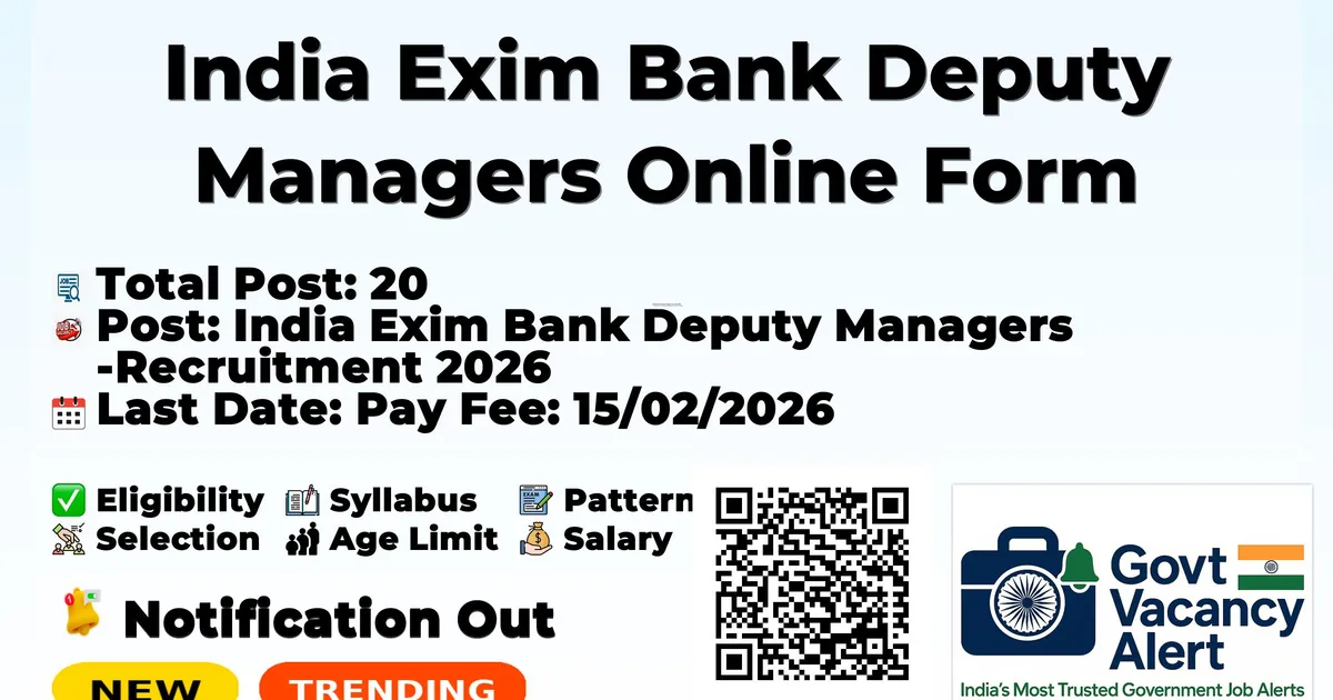India Exim Bank Deputy Managers 2026: India Exim Bank are invited to apply online application form for India Exim Bank Deputy Managers Recruitment 2026. Other information related to this recruitment like selection procedure, pay scale, age limit, syllabus information is available in the notification (India Exim Bank Deputy Managers Online Form 2026).