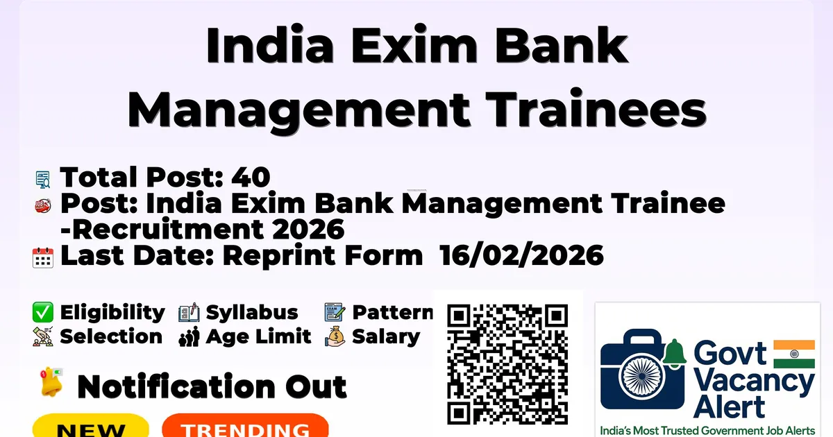 India Exim Bank Management Trainees 2026: India Exim Bank are invited to apply online application form for India Exim Bank Management Trainees Recruitment 2026. Other information related to this recruitment like selection procedure, pay scale, age limit, syllabus information is available in the notification (India Exim Bank Management Trainees Online Form 2026).