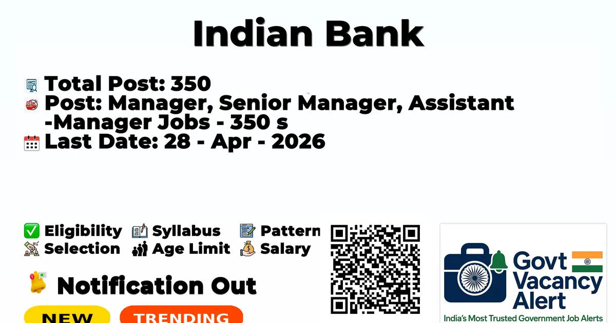 The Indian Bank has officially released the notification to fill the vacancies of 350 Manager, Senior Manager, and Assistant Manager Jobs. Interested and eligibile candidates can use this opportunity to apply for these posts before the last date of application. Candidates who have completed their MCA, M.Sc., MBA, M.E./M. Tech, B.E./B. Tech in Computer Science, Civil Engineering, or any degree can apply for the Indian Bank Jobs 2026. The interested applicants can apply in online mode. Here we have mentioned the education details, age limit, selection process, application fee, salary, and how to apply for these posts before the deadline. The application dates have already begun.