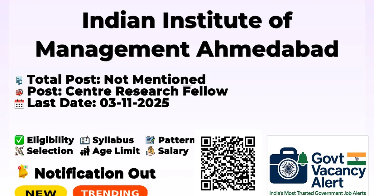 Indian Institute of Management Ahmedabad (IIM Ahmedabad) has released an official notification for the recruitment of Centre Research Fellow Posts. Interested and eligible candidates can apply Online through the official IIM Ahmedabad website. The last date to submit the application form is 03-11-2025. In this article, you’ll find the IIM Ahmedabad Centre Research Fellow Posts recruitment details, including eligibility criteria, age limit, salary structure, selection process, application steps, and direct links to the official notification and Online application form.