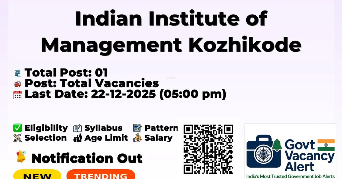 Indian Institute of Management Kozhikode (IIM Kozhikode) has released an official notification for the recruitment of 01 Technical Support Staff Posts. Interested and eligible candidates can apply Online through the official IIM Kozhikode website. The last date to submit the application form is 22-12-2025. In this article, you’ll find the IIM Kozhikode Technical Support Staff Posts recruitment details, including eligibility criteria, age limit, salary structure, selection process, application steps, and direct links to the official notification and Online application form.