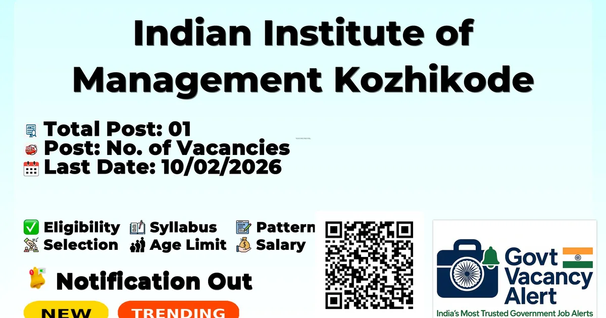 Indian Institute Of Management Kozhikode (IIM Kozhikode) has released an official notification for the recruitment of 01 Support Engineer Posts. Interested and eligible candidates can apply Online through the official IIM Kozhikode website. The last date to submit the application form is 10-02-2026. In this article, you’ll find the IIM Kozhikode Support Engineer Posts recruitment details, including eligibility criteria, age limit, salary structure, selection process, application steps, and direct links to the official notification and Online application form. Trending Govt Jobs India Post GDS Recruitment 2026 RRB 22000 Group D Online form 2026 RBI 572 Office Attendant Online Form 2026 IAF Agniveer New Recruitment 2026 Yantra India YIL 3979 Trade Apprentices Online Form 2026 Advertisement Company Name Indian Institute of Management Kozhikode (IIM Kozhikode ) Post Name Support Engineer (Electrical) No of Posts 01 Salary Rs. 24,300/- (including Rs.300/- towards telephone allowance) Qualification B.Tech/B.E Age Limit 35 Years Start Date 21/01/2026 Last Date for Apply 10/02/2026 Official Website https://iimk.ac.in/ Free Online Mock Tests View all Railway NTPC Mock Test Attempt Now IBPS Clerk Mock Test Attempt Now SSC CHSL Mock Test Attempt Now View All Mock Tests Post Name No. of Vacancies Support Engineer (Electrical) 01 Three Year full Time Diploma in Electrical Engineering with minimum four (04) years relevant experience. OR B.Tech /BE in Electrical Engineering with minimum two years relevant experience. In addition, the candidates should have good English communication, Proficiency in MS-Office and Internet usage. Rs. 24,300/- (including Rs.300/- towards telephone allowance) Maximum Age: 35 years Notification Date 21/01/2026 Application Last Date 10/02/2026 Walk-in Date To be announced Based on details submitted in the application, candidates will be shortlisted for selection process and interview. Eligible applications would be screened and only shortlisted candidates will be interviewed; through video conference. If selected, engagement will be subject to verification of all certificates and experience at the time of joining. Interested and eligible candidates may submit applications online at https://iimk.ac.in/ latest by 5:00 pm of 10.02.2026. Candidates are requested to upload their photograph, certificates, CV and signature, as per the format prescribed in the online portal. Candidates, who have submitted their applications, are advised to visit our website/ check their emails regularly, for getting update regarding interview schedule, if any. Official Notification PDF: Click Here Official Website: Click Here Join Arattai Channel: Click Here Join Telegram Channel: Click Here Join WhatsApp Channel: Click Here Sarkari Result: Click Here Download Mobile App: Click Here