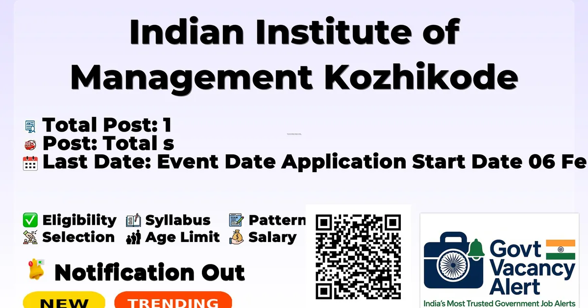 Indian Institute of Management Kozhikode (IIM Kozhikode) has officially released a notification for the recruitment of 1 Senior Coordinator (Students Affairs & Hostel) Posts. This recruitment drive offers a great opportunity for candidates looking for education jobs. Interested and eligible candidates can apply online through the official website. The online application process starts from 06-02-2026 and will remain open until 10-03-2026, so applicants are advised to submit their forms well before the deadline to avoid last-minute issues. In this article, you will find complete details about Senior Coordinator (Students Affairs & Hostel) Recruitment 2026, including vacancy details, eligibility criteria, age limit, salary, selection process, application steps, and important links. Advertisement Company Name Indian Institute of Management Kozhikode (IIM Kozhikode) Post Name Senior Coordinator (Students Affairs & Hostel) No of Posts 1 Advt No C-07/2026 Salary Approximately equivalent to consolidated pay of Pay Level 13. Qualification Post Graduation Degree/MBA/PGDM (2 years course) with 15 years of experience, including 5 years in Pay Level-12. Age Limit Max 50 years Last Date 10 March 2026 Apply Mode Online Job Type Contract Candidates should download and read the IIM Kozhikode Jobs 2026 notification PDF carefully to check vacancy details, eligibility, age limit, and application instructions. The notification also includes important dates and selection process details. The direct download link is available in the Important Links section below. Download IIM Kozhikode Senior Coordinator (Students Affairs & Hostel) Job 2026 Notification PDF Post Name Total Posts Senior Coordinator (Students Affairs & Hostel) 1 Total 1 Trending Govt Jobs RRB 22000 Group D Online form 2026 Indian Army Agniveer Recruitment Rally Notification 2026 AIIMS NORCET 10 Online Form 2026 HPCL 731 Engineers, JEA and More Online Form 2026 RBI 650 Assistant Online Form 2026 Senior Coordinator (Students Affairs & Hostel): Post Graduation Degree/MBA/PGDM (2 years course) with fifteen (15) years of service with at least Five (05) years relevant experience and a minimum of Five (05) years service in Pay Level-12 (Rs. 78800-209200) or equivalent relevant service and pay. Category Fee All Categories No application fee is mentioned in the official notification. Maximum Age Limit: 50 years Age Relaxation: As per Govt. of India Rules for Ex-Servicemen and Differently abled candidates. The salary is approximately equivalent to the consolidated pay of Pay Level 13. Event Date Application Start Date 06 February 2026 Application Last Date 10 March 2026 Interview only at Kochi/Kozhikode Certificate verification at the time of interview Candidates who meet the eligibility criteria can apply online for the IIM Kozhikode Senior Coordinator (Students Affairs & Hostel) Recruitment 2026. Applications must be submitted online on or before 10-03-2026. To apply directly, use the Apply Online link provided in the Important Links section. Alternatively, candidates may visit the official website of IIM Kozhikode to complete the application. Fill out the application form carefully with correct personal, educational, and contact details. Upload required documents such as photograph, signature, and certificates in the prescribed format. Pay the application fee online, if applicable. Review all details carefully before submitting the form. Take a printout or save a copy of the submitted application for future reference. Link Description Link Official Notification PDF Click here Apply Online Click here Official Website Click here