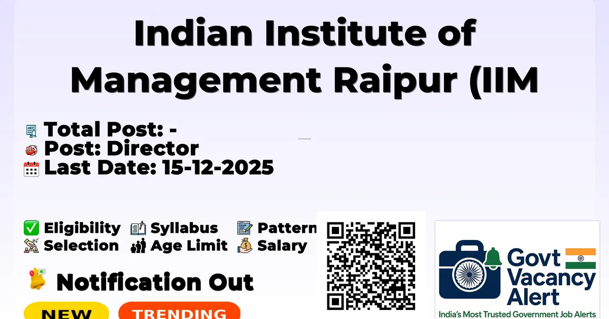 Company Name Indian Institute of Management Raipur (IIM Raipur) Post Name Director No of Posts - Qualification Any Bachelors Degree, Any Masters Degree, M.Phil/Ph.D Age Limit 70 years Start Date for Apply 15-11-2025 Last Date for Apply 15-12-2025 Official Website iimraipur.ac.in