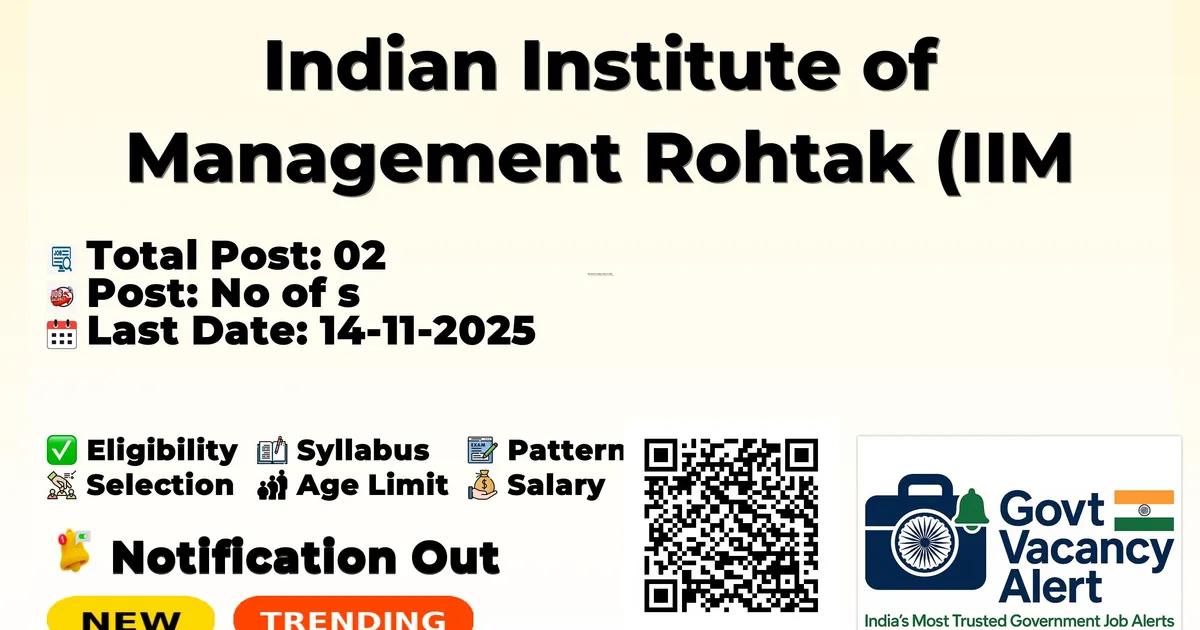 Company Name Indian Institute of Management Rohtak (IIM Rohtak) Post Name Corporate Relationship Officer, Procurement Manager No of Posts 02 Pay Matrix Rs.56100 - 208700 Qualification Diploma, Any Post Graduate, MBA/PGDM, PG Diploma Age Limit 45 to 50 years Last Date for Apply 14-11-2025 Official Website iimrohtak.ac.in