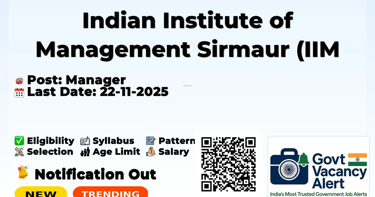 Indian Institute of Management Sirmaur (IIM Sirmaur) has released an official notification for the recruitment of Not Mentioned Manager Posts. Interested and eligible candidates can apply Offline through the official IIM Sirmaur website. The last date to submit the application form is 22-11-2025. In this article, you’ll find the IIM Sirmaur Manager Posts recruitment details, including eligibility criteria, age limit, salary structure, selection process, application steps, and direct links to the official notification and Offline application form.