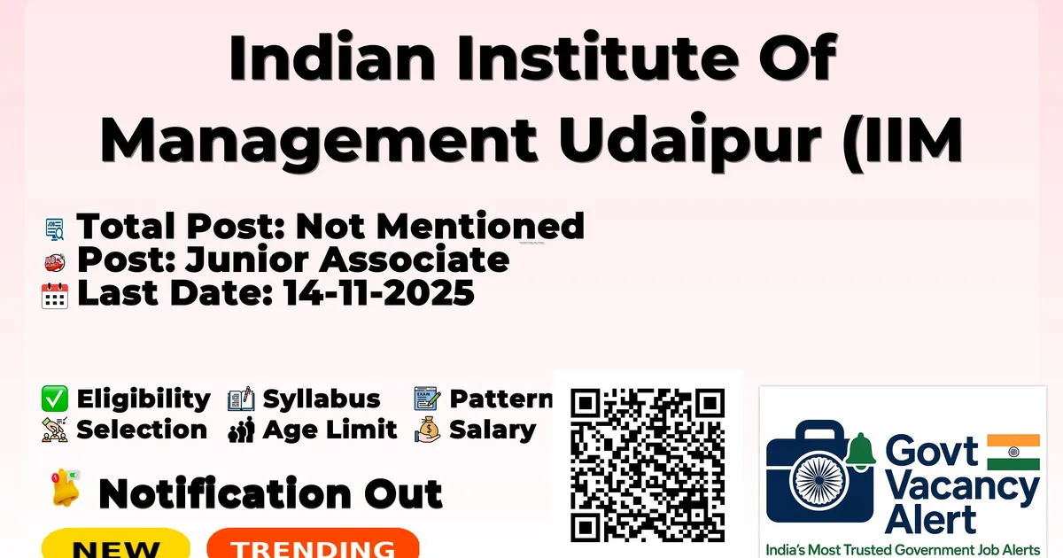 Indian Institute Of Management Udaipur (IIM Udaipur) has released an official notification for the recruitment of Junior Associate Posts. Interested and eligible candidates can apply Online through the official IIM Udaipur website. The last date to submit the application form is 14-11-2025. In this article, you’ll find the IIM Udaipur Junior Associate Posts recruitment details, including eligibility criteria, age limit, salary structure, selection process, application steps, and direct links to the official notification and Online application form.