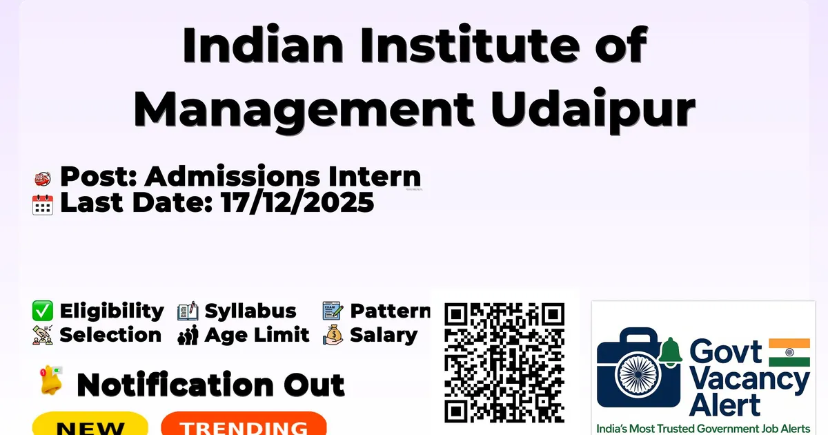 Indian Institute of Management Udaipur (IIMU) has released an official notification for the recruitment of Admissions Intern Posts. Interested and eligible candidates can apply Online through the official IIMU website. The last date to submit the application form is 17-12-2025. In this article, you’ll find the IIMU Admissions Intern Posts recruitment details, including eligibility criteria, age limit, salary structure, selection process, application steps, and direct links to the official notification and Online application form.