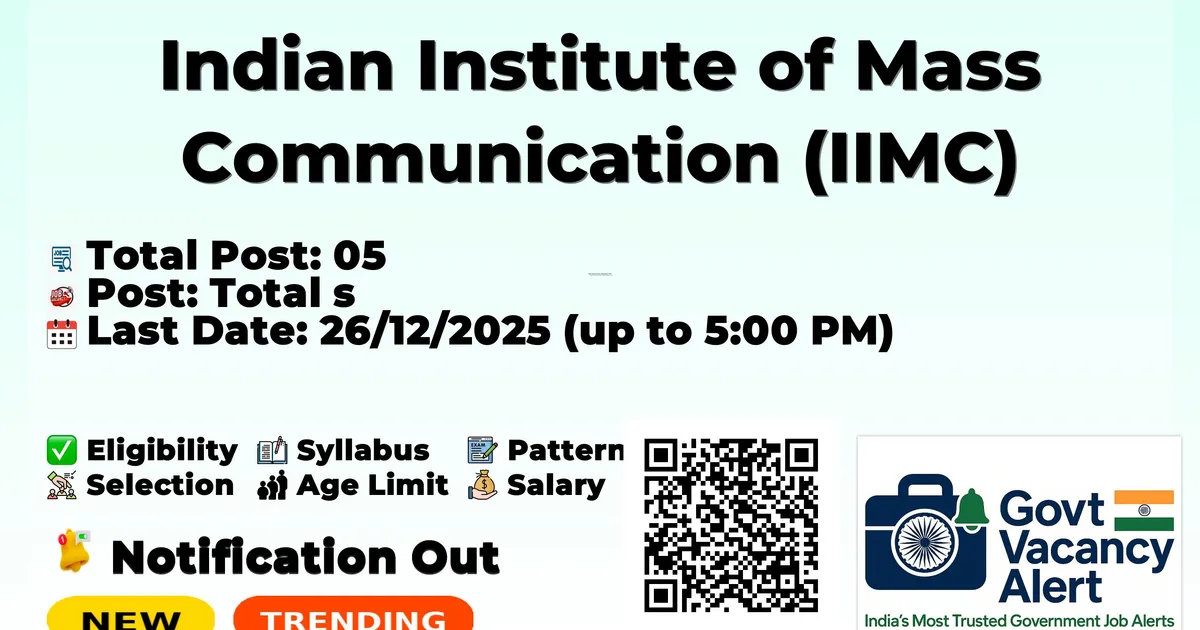 Indian Institute of Mass Communication (IIMC) has released an official notification for the recruitment of 05 Academic cum Teaching Associate Posts. Interested and eligible candidates can apply Offline through the official IIMC website. The last date to submit the application form is 26-12-2025. In this article, you’ll find the IIMC Academic cum Teaching Associate Posts recruitment details, including eligibility criteria, age limit, salary structure, selection process, application steps, and direct links to the official notification and Offline application form.