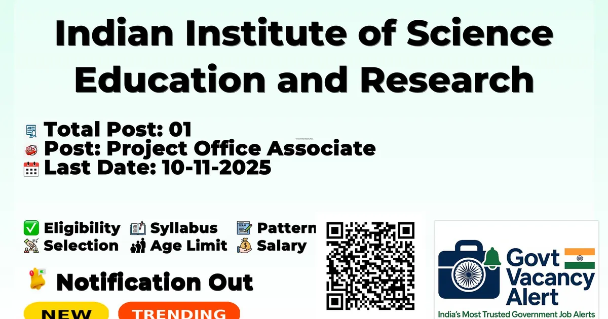 Indian Institute of Science Education and Research Bhopal (IISER Bhopal) has released an official notification for the recruitment of 01 Project Office Associate Posts. Interested and eligible candidates can apply Online through the official IISER Bhopal website. The last date to submit the application form is 10-11-2025. In this article, you’ll find the IISER Bhopal Project Office Associate Posts recruitment details, including eligibility criteria, age limit, salary structure, selection process, application steps, and direct links to the official notification and Online application form.