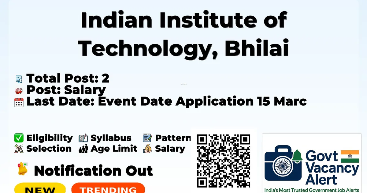 Indian Institute of Technology, Bhilai (IIT Bhilai) has officially released a notification for the recruitment of 2 Project Engineer / Project Assistant Posts. This recruitment drive offers a great opportunity for candidates looking for education jobs. Interested and eligible candidates can apply online through the official website. The last date to apply online is 15-03-2026, so applicants are advised to submit their forms well before the deadline to avoid last-minute issues. In this article, you will find complete details about Project Engineer / Project Assistant Recruitment 2026, including vacancy details, eligibility criteria, age limit, salary, selection process, application steps, and important links. Advertisement Company Name Indian Institute of Technology, Bhilai Post Name Project Engineer / Project Assistant No of Posts 2 Salary Rs. 28000 - 75000 Per Month Qualification M.Tech/M.E./B.Tech in Electrical Engineering Age Limit Project Engineer: 40-45 years. Project Assistant: 35 years Last Date 15 March 2026 Apply Mode Online Job Type Contract Trending Govt Jobs IAF Agniveer New Recruitment 2026 UPSC CSE Online Form 2026 DSSSB 911 AE, JE & More Online Form 2026 RRB 22000 Group D Online form 2026 MCL 677 Various Vacancies Online Form 2026 Candidates who are interested in applying for the IIT Bhilai Recruitment 2026 should first download and carefully read the official notification PDF. The notification contains complete details about vacancy distribution, eligibility criteria, age limit, stipend/salary, selection process, important dates, and application instructions. Reading the official document is important to ensure that you meet all requirements before submitting the application form. Download IIT Bhilai Job 2026 Notification PDF Post Name Total Posts Project Engineer 1 Project Assistant 1 Total 2 Project Engineer: M.Tech/M.E. or equivalent in Electrical Engineering with relevant experience. Preference for hands-on experience in DC/DC converters, power electronics-based chargers, and MATLAB/Simulink modeling. Experience in smart energy systems, EV charging infrastructure, embedded systems, energy metering, and communication protocols (RS485, CAN, Modbus, UART) is an added advantage. Project Assistant: M.Tech/M.E. or B.Tech in Electrical Engineering with relevant experience. Strong knowledge of smart energy systems, power electronics, embedded systems, EV charging, hardware interfacing, and communication protocols (RS485, Modbus, CAN, UART, SPI, I²C). Experience with smart meters, EMS, renewable energy integration, EV chargers, and IoT-based energy monitoring is an added advantage. Project Engineer: Minimum age 40 years, Maximum age 45 years. Project Assistant: Maximum age 35 years. Post Name Salary Note Project Engineer Rs. 40000-75000 Per Month Without HRA. Duration: 01 Year, Extendable as per project funds availability Project Assistant Rs. 28000-41000 Per Month Without HRA. Duration: 01 Year, Extendable as per project funds availability Event Date Application Last Date 15 March 2026 Interview To be communicated after application submission Offline Interview (Details to be communicated after applications received) Interview will be conducted on-site; no TA/DA will be provided Decision of selection committee will be final If large number of candidates, selection committee may restrict to reasonable limit based on qualifications and experience Applications must be submitted online on or before 15-03-2026. To apply directly, use the Apply Online link provided in the Important Links section. Alternatively, candidates may visit the official website of IIT Bhilai to complete the application. Fill out the application form carefully with correct personal, educational, and contact details. Upload required documents such as photograph, signature, and certificates in the prescribed format. Pay the application fee online, if applicable. Review all details carefully before submitting the form. Take a printout or save a copy of the submitted application for future reference. Link Description Link Official Notification PDF Click here Official Website Click here
