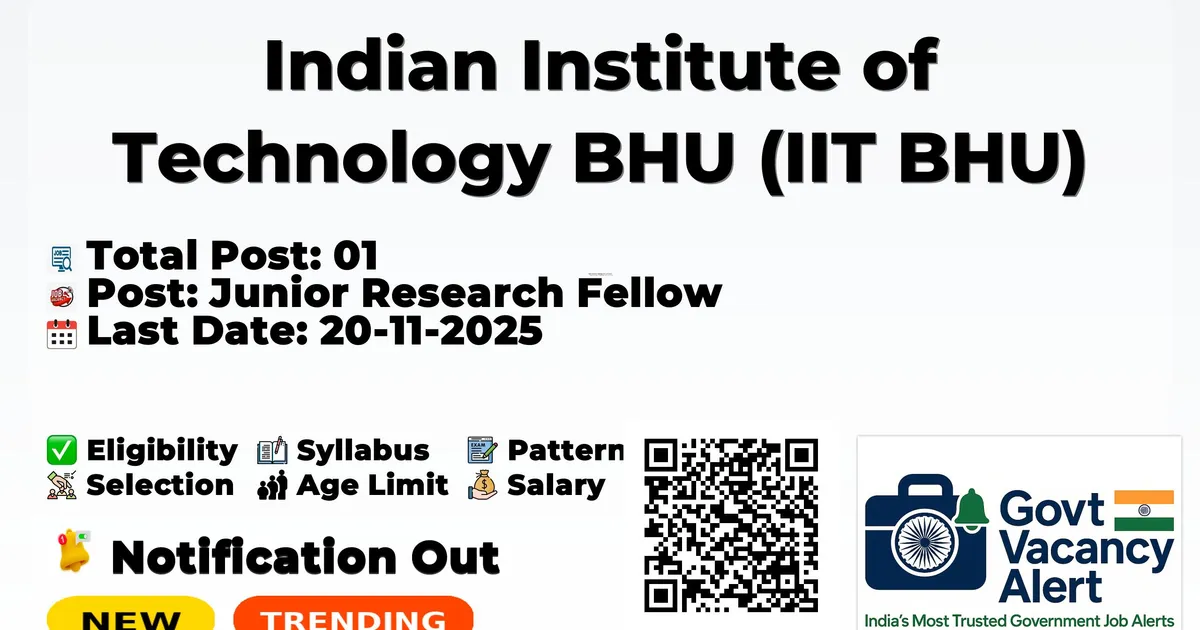 Indian Institute of Technology BHU (IIT BHU) has released an official notification for the recruitment of 01 Junior Research Fellow Posts. Interested and eligible candidates can apply Online through the official IIT BHU website. The last date to submit the application form is 20-11-2025. In this article, you’ll find the IIT BHU Junior Research Fellow Posts recruitment details, including eligibility criteria, age limit, salary structure, selection process, application steps, and direct links to the official notification and Online application form.