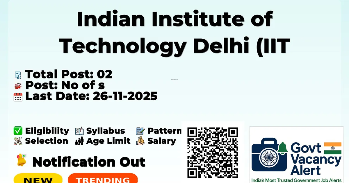 Company Name Indian Institute of Technology Delhi (IIT Delhi) Post Name Institute Engineer, Executive Engineer No of Posts 02 Age Limit 56 to 57 years Start Date for Apply Online 13-11-2025 Last Date for Apply Online 26-11-2025 Official Website iitd.ac.in