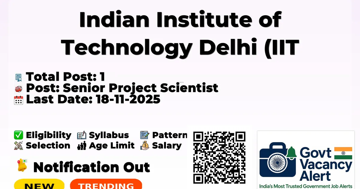 Indian Institute of Technology Delhi (IIT Delhi) has released an official notification for the recruitment of 1 Senior Project Scientist Posts. Interested and eligible candidates can apply Offline through the official IIT Delhi website. The last date to submit the application form is 18-11-2025. In this article, you’ll find the IIT Delhi Senior Project Scientist Posts recruitment details, including eligibility criteria, age limit, salary structure, selection process, application steps, and direct links to the official notification and Offline application form.