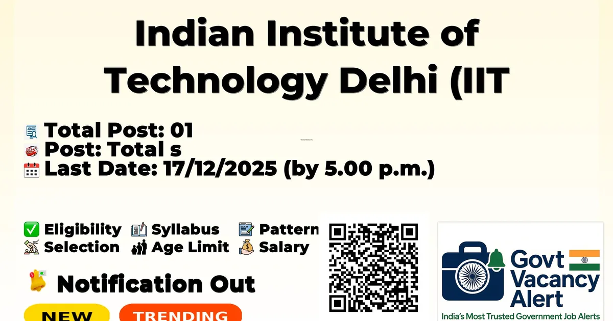 Indian Institute of Technology Delhi (IIT Delhi) has released an official notification for the recruitment of 01 Junior Research Fellow Posts. Interested and eligible candidates can apply Offline through the official IIT Delhi website. The last date to submit the application form is 17-12-2025. In this article, you’ll find the IIT Delhi Junior Research Fellow Posts recruitment details, including eligibility criteria, age limit, salary structure, selection process, application steps, and direct links to the official notification and Offline application form.