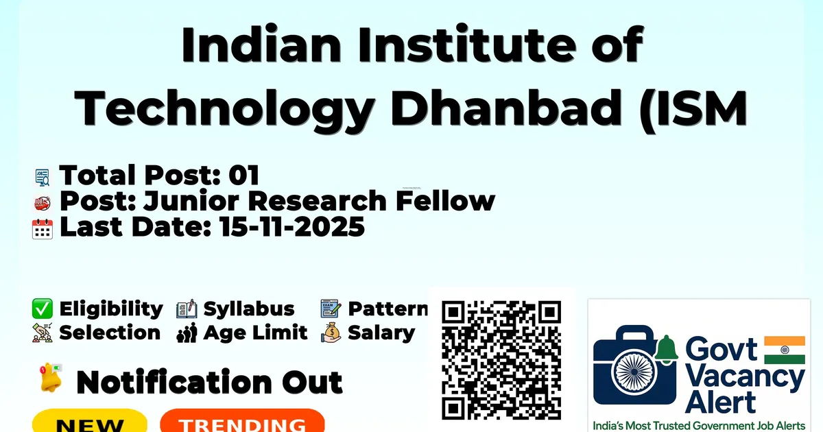 Indian Institute of Technology Dhanbad (ISM Dhanbad) has released an official notification for the recruitment of 01 Junior Research Fellow Posts. Interested and eligible candidates can apply Offline through the official ISM Dhanbad website. The last date to submit the application form is 15-11-2025. In this article, you’ll find the ISM Dhanbad Junior Research Fellow Posts recruitment details, including eligibility criteria, age limit, salary structure, selection process, application steps, and direct links to the official notification and Offline application form.