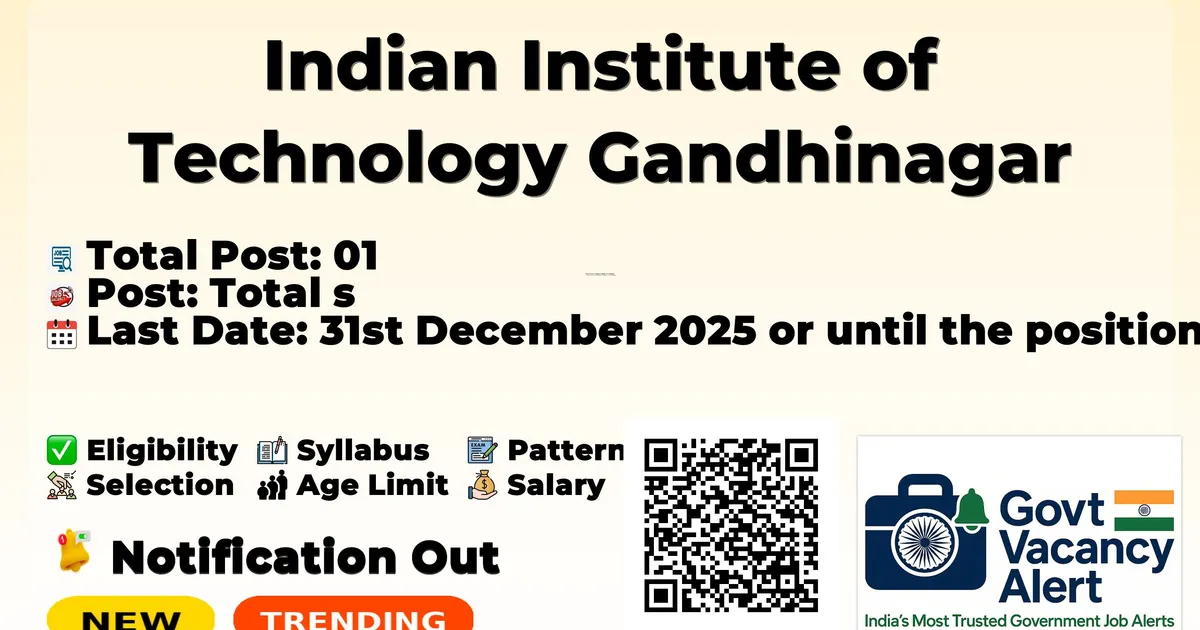 Indian Institute of Technology Gandhinagar (IIT Gandhinagar) has released an official notification for the recruitment of Junior Research Fellow Posts. Interested and eligible candidates can apply Offline through the official IIT Gandhinagar website. The last date to submit the application form is 31-12-2025. In this article, you’ll find the IIT Gandhinagar Junior Research Fellow Posts recruitment details, including eligibility criteria, age limit, salary structure, selection process, application steps, and direct links to the official notification and Offline application form.