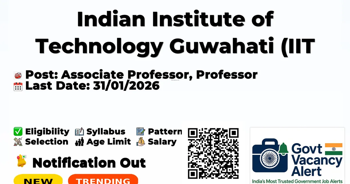 Company Name Indian Institute of Technology Guwahati (IIT Guwahati) Post Name Associate Professor, Professor Salary Associate Professor: 7th CPC Pay level 13A2; Professor: 7th CPC Pay level 14A Qualification Ph.D. with first class or equivalent in the preceding degree in an appropriate branch with a very good academic record throughout Start Date for Apply 24/12/2025 Last Date for Apply 31/01/2026 Official Website https://www.iitg.ac.in