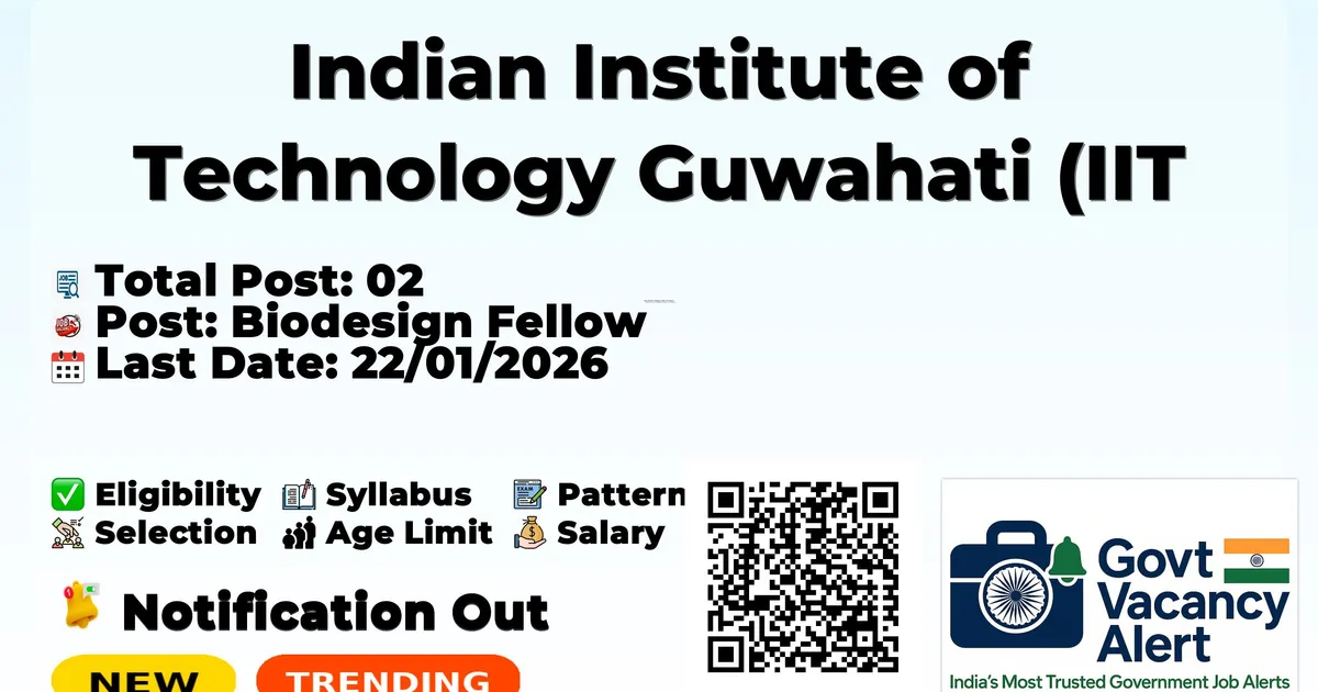 Indian Institute of Technology Guwahati (IIT Guwahati) has released an official notification for the recruitment of 02 Biodesign Fellow Posts. Interested and eligible candidates can apply Online through the official IIT Guwahati website. The last date to submit the application form is 22-01-2026. In this article, you’ll find the IIT Guwahati Biodesign Fellow Posts recruitment details, including eligibility criteria, age limit, salary structure, selection process, application steps, and direct links to the official notification and Online application form.