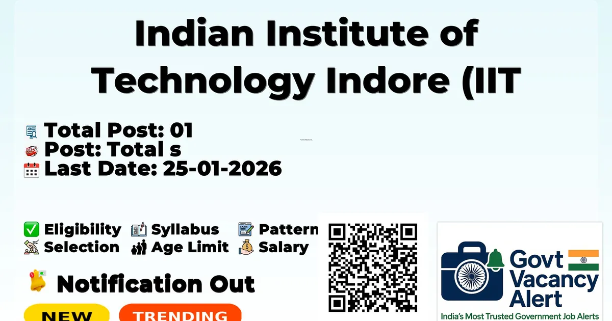 Indian Institute of Technology Indore (IIT Indore) has released an official notification for the recruitment of 01 Junior Research Fellow Posts. Interested and eligible candidates can apply Online through the official IIT Indore website. The last date to submit the application form is 25-01-2026. In this article, you’ll find the IIT Indore Junior Research Fellow Posts recruitment details, including eligibility criteria, age limit, salary structure, selection process, application steps, and direct links to the official notification and Online application form.