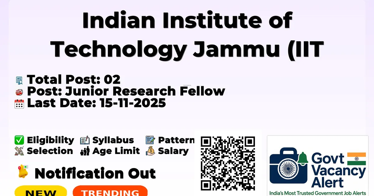 Indian Institute of Technology Jammu (IIT Jammu) has released an official notification for the recruitment of 02 Junior Research Fellow Posts. Interested and eligible candidates can apply Online through the official IIT Jammu website. The last date to submit the application form is 15-11-2025. In this article, you’ll find the IIT Jammu Junior Research Fellow Posts recruitment details, including eligibility criteria, age limit, salary structure, selection process, application steps, and direct links to the official notification and Online application form.