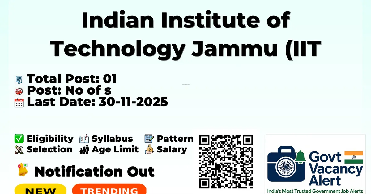 Indian Institute of Technology Jammu (IIT Jammu) has released an official notification for the recruitment of 01 Junior Research Fellow Posts. Interested and eligible candidates can apply Online through the official IIT Jammu website. The last date to submit the application form is 30-11-2025. In this article, you’ll find the IIT Jammu Junior Research Fellow Posts recruitment details, including eligibility criteria, age limit, salary structure, selection process, application steps, and direct links to the official notification and Online application form.