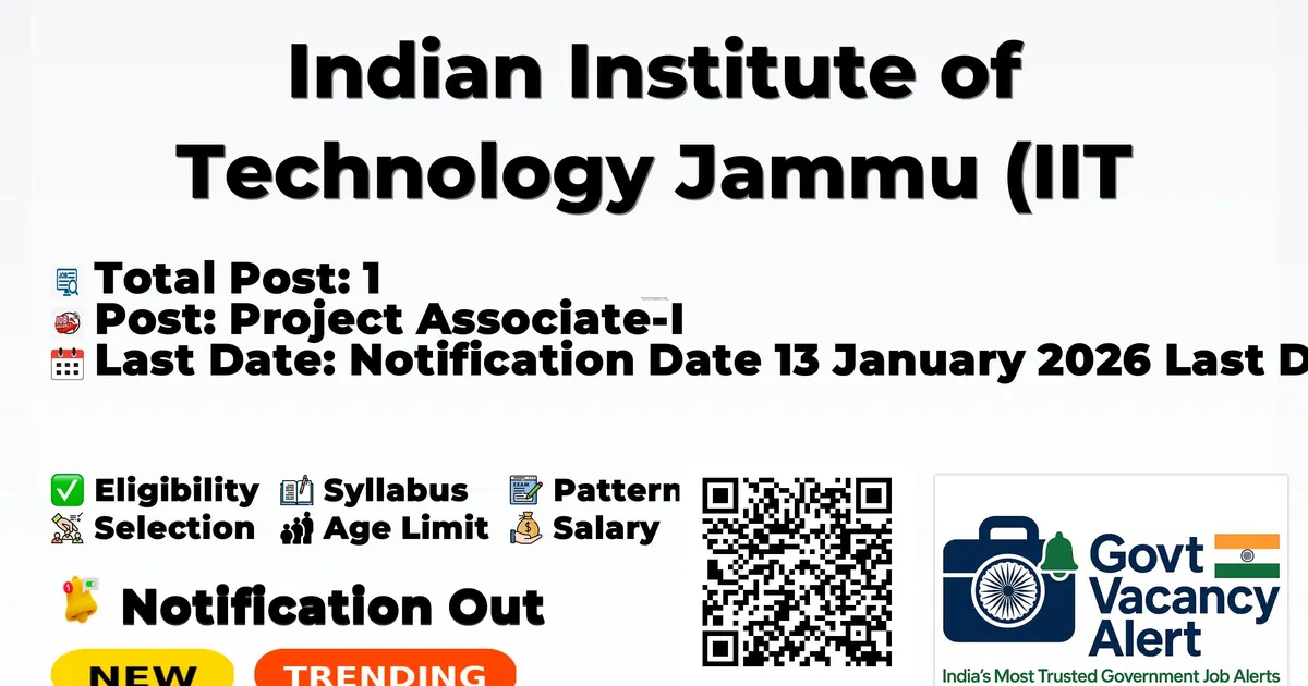 Indian Institute of Technology Jammu (IIT Jammu) has released an official notification for the recruitment of 01 Project Associate I Posts. Interested and eligible candidates can apply Online through the official IIT Jammu website. The last date to submit the application form is 21-01-2026. In this article, you’ll find the IIT Jammu Project Associate I Posts recruitment details, including eligibility criteria, age limit, salary structure, selection process, application steps, and direct links to the official notification and Online application form. Advertisement Company Name Indian Institute of Technology Jammu (IIT Jammu) Post Name Project Associate-I No of Posts 1 Salary INR 42,000 (Consolidated) Qualification B.Tech/BE in CSE/IT/ECE or MCA or relevant areas Age Limit Up to 35 years Last Date 21/01/2026 Official Website https://www.iitjammu.ac.in/ Free Online Mock Tests View all Railway NTPC Mock Test Attempt Now IBPS Clerk Mock Test Attempt Now SSC CHSL Mock Test Attempt Now View All Mock Tests No. of Positions Position 1 Project Associate-I Qualification: B.Tech/BE in CSE/IT/ECE or MCA or relevant areas Experience: One Year experience with Android, Linux, and Windows systems Desirable Qualification: Working knowledge of Information Security and penetration tools. Desirable Qualification: Good communication skills INR 42000 (Consolidated) per Month Upper age limit: 35 years Age relaxation: upper age limit is relaxed up to 5 years for SC/ST/OBC/women and physically handicapped candidates Notification Date 13 January 2026 Last Date for Receiving Application 21 January 2026 Candidates may be shortlisted based on merit and need for the project. Shortlisted candidates will be informed by e-mail about the interview. The interview will be held using the online platform. The duly filled application form, along with the requested details, scanned copies of certificates, and other supporting documents, should be uploaded through the online portal by 21 Jan 2026. Please apply through the [contract/project staff/JRF/SRF] tab on the referred application portal. Trending Govt Jobs Bank of Maharashtra 600 Apprentice Online form 2026 RBI 572 Office Attendant Online Form 2026 IOCL Western Region 405 Apprentice Online Form 2026 RRB 22000 Group D Online form 2026 Indian Navy 260 SSC Officer Online Form 2026 Apply Online: Click here Official Notification PDF: Click here Official Website: Click here Join Arattai Channel: Click Here Join Telegram Channel: Click Here Join WhatsApp Channel: Click Here Sarkari Result: Click Here Download Mobile App: Click Here