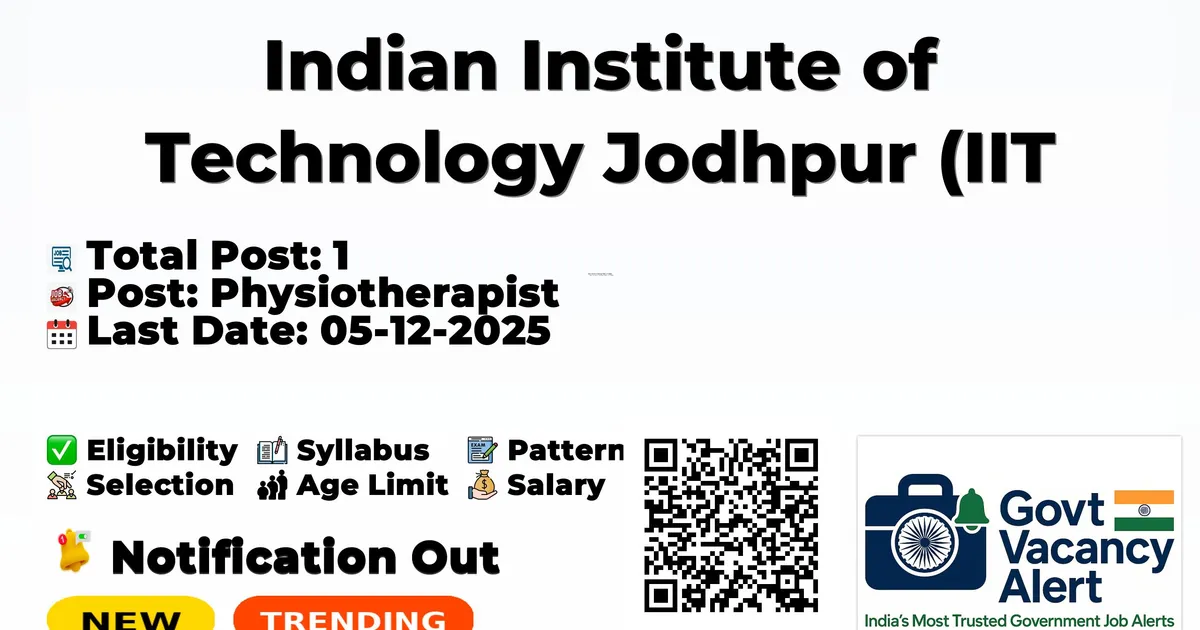 Indian Institute of Technology Jodhpur (IIT Jodhpur) has released an official notification for the recruitment of 1 Physiotherapist Posts. Interested and eligible candidates can apply Online through the official IIT Jodhpur website. The last date to submit the application form is 05-12-2025. In this article, you’ll find the IIT Jodhpur Physiotherapist Posts recruitment details, including eligibility criteria, age limit, salary structure, selection process, application steps, and direct links to the official notification and Online application form.