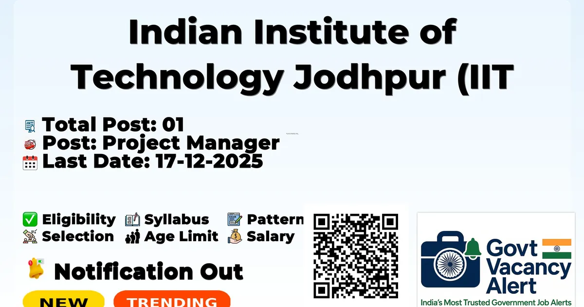 Indian Institute of Technology Jodhpur (IIT Jodhpur) has released an official notification for the recruitment of 01 Project Manager Posts. Interested and eligible candidates can apply Online through the official IIT Jodhpur website. The last date to submit the application form is 17-12-2025. In this article, you’ll find the IIT Jodhpur Project Manager Posts recruitment details, including eligibility criteria, age limit, salary structure, selection process, application steps, and direct links to the official notification and Online application form. Join Arattai Channel Trending Govt Jobs SSC 25487 GD Constable Online Form 2025 OICL 300 AO Online Form 2025 RRB NTPC 12TH Level Online Form 2025 3058 Post Intelligence Bureau (IB) 362 MTS Online Form 2025 RRB 2569 JE (Junior Engineer) Online Form 2025 Advertisement Company Name Indian Institute of Technology Jodhpur (IIT Jodhpur) Post Name Project Manager No of Posts 01 Salary Rs 100000 Qualification Post Graduate Age Limit 40 years Start Date for Apply Online 02-12-2025 Last Date for Apply Online 17-12-2025 Official Website iitj.ac.in Position Vacancies Consolidated Compensation Project Manager 01 Rs.100000 (Upto) An outstanding Scientist/Engineer/Technologist with degree in Engineering/ Technology having 3-5 years of industry experience (specifically in delivery of technology projects) Post-Graduate: 3 Years Experience in relevant area. Under-Graduate: 5 Years Experience in relevant area Desirable Qualifications/Experiance: Experience in Project Management/ Finance/Business Administration Multi-sectoral experience such as in Academia, Industry, Foundations, Government organizations Maximum Age limit: 40 Years Age relaxation is applicable as per rules. No Application Fee Starting Date for Apply Online: 02-12-2025 Last Date for Apply Online: 17-12-2025 Apply Online: Click here Official Notification PDF: Click here Official Website: Click here Join Arattai Channel: Click Here Join Telegram Channel: Click Here Join WhatsApp Channel: Click Here Sarkari Result Vacancy: Click Here Download Mobile App: Click Here Jobs In Rajasthan Ajmer Alwar Banswara Baran Barmer Bharatpur Bhilwara Bikaner Bundi Chittaurgarh Churu Dausa Dhaulpur Dungarpur Ganganagar Hanumangarh Jaipur Jaisalmer Jalor Jhalawar Jhunjhunun Jodhpur Karauli Kota Nagaur Pali Pratapgarh Rajasthan Rajsamand Sawai Madhopur Sikar Sirohi Tonk Udaipur Also Read Territorial Army Rally Recruitment 2025 - 1500+ Vacancies - 8TH, 10TH, 12TH Pass Candidates Can Apply AIIMS CRE Recruitment 2025 - 1300+ Group B and Group C Posts - Apply Link Click Here RRB Recruitment 2025 - 2500+ JE (Junior Engineer) Vacancies - 35400 Monthly Salary - Apply Now Jobs By Education 10TH Jobs› 8TH Jobs› 12TH Jobs› Diploma Jobs› ITI Jobs› B.Tech/B.E Jobs› B.com Jobs› Any Graduate Jobs› Any Post Graduate Jobs› Maharashtra 15631 Police Constable Online Form 2025 SBI 996 SCO Online Form 2025 EMRS Teaching and NonTeaching Admit Card 2025 SSC 25487 GD Constable Online Form 2025 IBPS RRB Clerk Admit Card 2025 RRB Group D Admit Card 2025 Delhi Police Head Constable (Ministerial) Admit Card 2025 IOCL 2,756 Apprentices Online Form 2025 RRB NTPC 12TH Level Online Form 2025 3058 Post 1. What is the starting date to apply online for IIT Jodhpur Project Manager 2025? Ans: Starting Date to apply online is 02-12-2025. 2. What is the last online apply date for IIT Jodhpur Project Manager 2025? Ans: Last online apply date is 17-12-2025. 3. What is the Eligibility to apply for IIT Jodhpur Project Manager 2025? Ans: Any Post Graduate 4. What is the Maximum Age Limit to apply for IIT Jodhpur Project Manager 2025? Ans: 40 Years 5. How many vacancies are being recruited by IIT Jodhpur Project Manager 2025? Ans: Total 01 Vacancies.