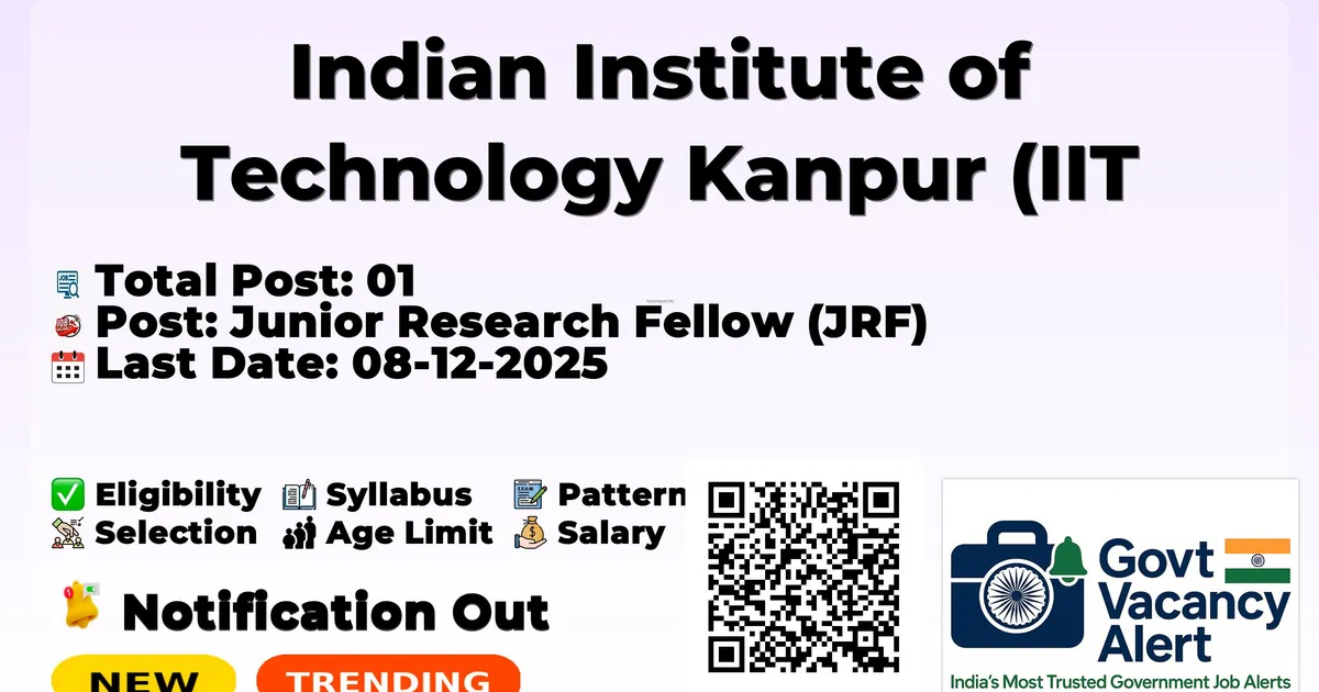 Company Name Indian Institute of Technology Kanpur (IIT Kanpur) Post Name Junior Research Fellow (JRF) No of Posts 01 Salary Fellowship (JRF) – Rs. 37,000/- per month Qualification As per essential qualification and desirable competencies specified in the advertisement Age Limit Base upper age not mentioned; relaxation up to 5 years for SC/ST/OBC, women and physically handicapped candidates Start Date for Apply 28-11-2025 Last Date for Apply 08-12-2025 Official Website iitk.ac.in