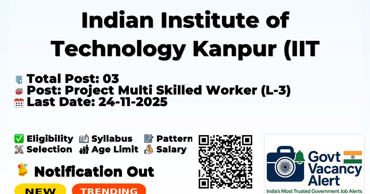 Indian Institute of Technology Kanpur (IIT Kanpur) has released an official notification for the recruitment of 03 Project Multi Skilled Worker Posts. Interested and eligible candidates can apply Online through the official IIT Kanpur website. The last date to submit the application form is 24-11-2025. In this article, you’ll find the IIT Kanpur Project Multi Skilled Worker Posts recruitment details, including eligibility criteria, age limit, salary structure, selection process, application steps, and direct links to the official notification and Online application form.