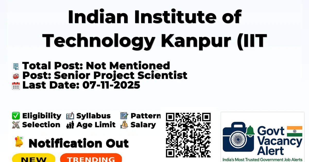 Indian Institute of Technology Kanpur (IIT Kanpur) has released an official notification for the recruitment of Senior Project Scientist Posts. Interested and eligible candidates can apply Offline through the official IIT Kanpur website. The last date to submit the application form is 07-11-2025. In this article, you’ll find the IIT Kanpur Senior Project Scientist Posts recruitment details, including eligibility criteria, age limit, salary structure, selection process, application steps, and direct links to the official notification and Offline application form.