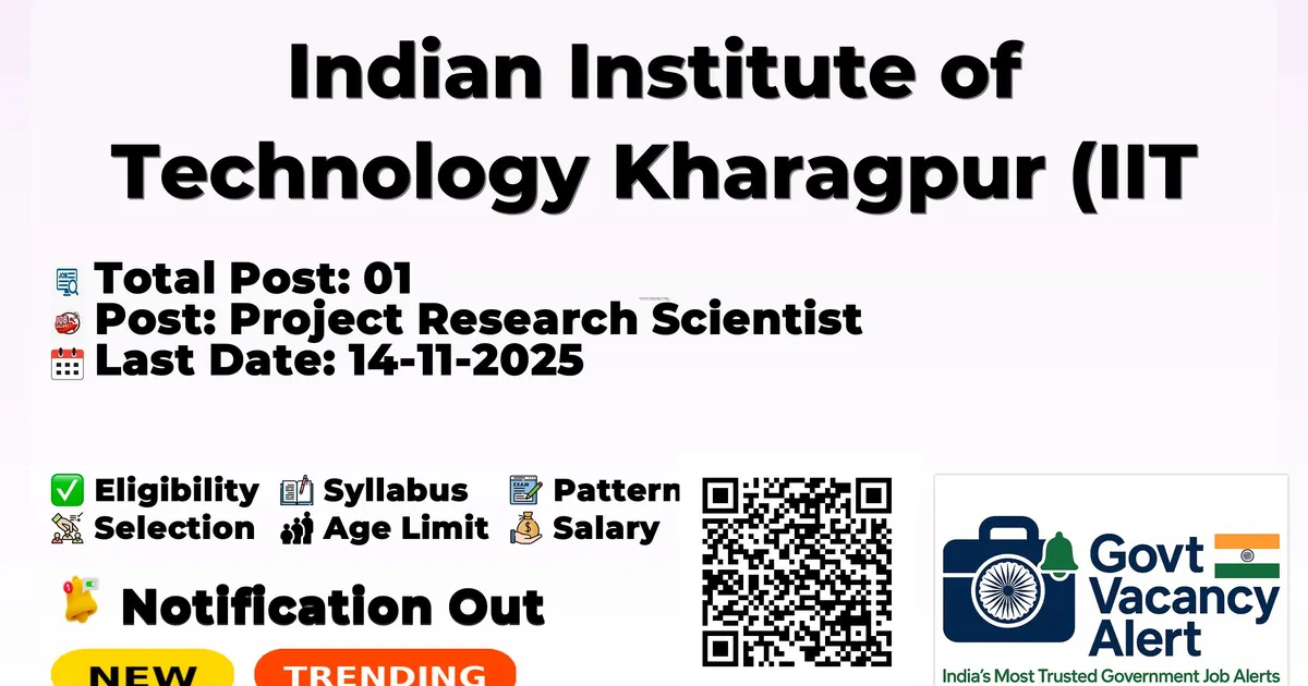 Indian Institute of Technology Kharagpur (IIT Kharagpur) has released an official notification for the recruitment of 01 Project Research Scientist Posts. Interested and eligible candidates can apply Online through the official IIT Kharagpur website. The last date to submit the application form is 14-11-2025. In this article, you’ll find the IIT Kharagpur Project Research Scientist Posts recruitment details, including eligibility criteria, age limit, salary structure, selection process, application steps, and direct links to the official notification and Online application form.