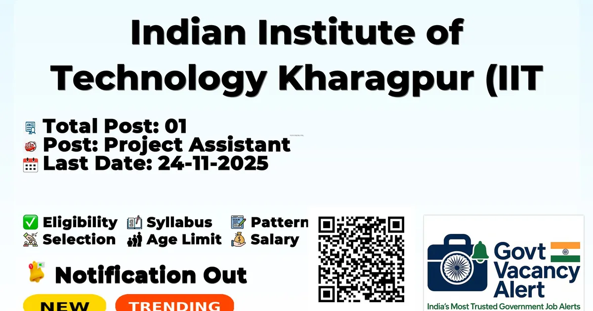 Indian Institute of Technology Kharagpur (IIT Kharagpur) has released an official notification for the recruitment of 01 Project Assistant Posts. Interested and eligible candidates can apply Online through the official IIT Kharagpur website. The last date to submit the application form is 24-11-2025. In this article, you’ll find the IIT Kharagpur Project Assistant Posts recruitment details, including eligibility criteria, age limit, salary structure, selection process, application steps, and direct links to the official notification and Online application form. Join Arattai Channel Trending Govt Jobs SAIL 124 Management Trainee (Tech) Online Form 2025 KVS and NVS Online Form 2025 RRB NTPC 5,810 Online Form 2025 Bank of Baroda 2700 Apprentices Online Form 2025 Intelligence Bureau (IB) ACIO II Tech Online Form 2025 Advertisement Company Name Indian Institute of Technology Kharagpur (IIT Kharagpur) Post Name Project Assistant No of Posts 01 Salary Rs. 25000 Qualification Any Graduate Age Limit 30 years Start Date for Apply Online 10-11-2025 Last Date for Apply Online 24-11-2025 Official Website iitkgp.ac.in Graduation in any discipline and at least 60% marks in all the qualifying degrees. and working knowledge of MS word, Excel and Power Point. Candidates with an electronics background and hands-on experience with Arduino and Raspberry Pi will be preferred. Maximum Age limit: 30 Years Age relaxation is applicable as per rules. NIL Starting Date for Apply Online: 10-11-2025 Last Date for Apply Online: 24-11-2025 Apply Online: Click here Official Notification PDF: Click here Official Website: Click here Join Arattai Channel: Click Here Join Telegram Channel: Click Here Join WhatsApp Channel: Click Here Sarkari Result: Click Here Download Mobile App: Click Here Jobs In West Bengal Alipurduar Asansol Bankura Barddhaman Birbhum Burdwan Dakshin Dinajpur Darjiling Durgapur Haldia Howrah Hugli Jalpaiguri Jhargram Kharagpur Koch Bihar Kolkata Malda Midnapur Murshidabad Nadia North Twenty Four Parganas Paschim Medinipur Purba Medinipur Puruliya Raniganj Siliguri South Twenty Four Parganas Uttar Dinajpur Also Read SEBI Recruitment 2025 - Officer Grade A (Assistant Manager) Vacancies - Rs 62500 to 126100 Salary - Apply Now Intelligence Bureau ACIO II Tech Recruitment 2025 - 200+ Vacancies Across India - 44900-142400 Salary - Apply Now RRB Recruitment 2025 - 2500+ JE (Junior Engineer) Vacancies - 35400 Monthly Salary - Apply Now Jobs By Education 10TH Jobs› 8TH Jobs› 12TH Jobs› Diploma Jobs› ITI Jobs› B.Tech/B.E Jobs› B.com Jobs› Any Graduate Jobs› Any Post Graduate Jobs› Bank of Baroda 2700 Apprentices Online Form 2025 RRB 2569 JE (Junior Engineer) Online Form 2025 RRB NTPC 12TH Level Online Form 2025 3058 Post BRO 542 MSW, Vehicle Mechanic Offline Form 2025 Territorial Army 1529 Soldier Offline Form 2025 ONGC 2623 Apprentices Online Form 2025 BSSC 23175 Inter Level Online Form 2025 ISRO SDSC SHAR Various Vacancy Online Form 2025 RRB NTPC 8850 Online Form 202526 1. What is the starting date to apply online for IIT Kharagpur Project Assistant 2025? Ans: Starting Date to apply online is 10-11-2025. 2. What is the last online apply date for IIT Kharagpur Project Assistant 2025? Ans: Last online apply date is 24-11-2025. 3. What is the Eligibility to apply for IIT Kharagpur Project Assistant 2025? Ans: Any Graduate 4. What is the Maximum Age Limit to apply for IIT Kharagpur Project Assistant 2025? Ans: 30 Years 5. How many vacancies are being recruited by IIT Kharagpur Project Assistant 2025? Ans: Total 01 Vacancies.