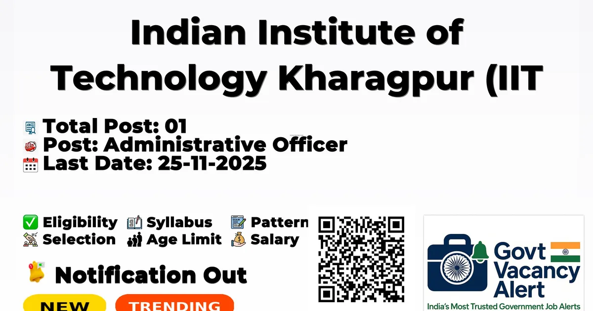 Company Name Indian Institute of Technology Kharagpur (IIT Kharagpur) Post Name Administrative Officer No of Posts 01 Salary Rs.35,000/- Qualification Any Graduate Age Limit 40 years Start Date for Apply Online 11-11-2025 Last Date for Apply Online 25-11-2025 Official Website iitkgp.ac.in