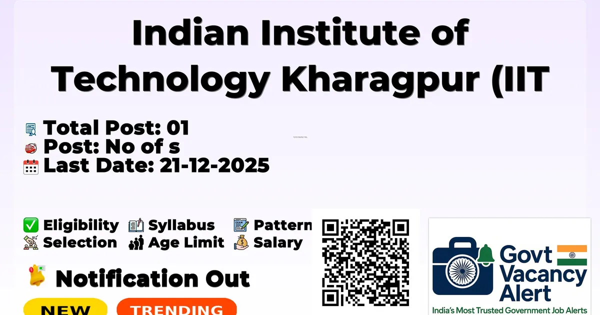 Indian Institute of Technology Kharagpur (IIT Kharagpur) has released an official notification for the recruitment of 01 Junior Research Fellowship Posts. Interested and eligible candidates can apply Online through the official IIT Kharagpur website. The last date to submit the application form is 21-12-2025. In this article, you’ll find the IIT Kharagpur Junior Research Fellowship Posts recruitment details, including eligibility criteria, age limit, salary structure, selection process, application steps, and direct links to the official notification and Online application form.
