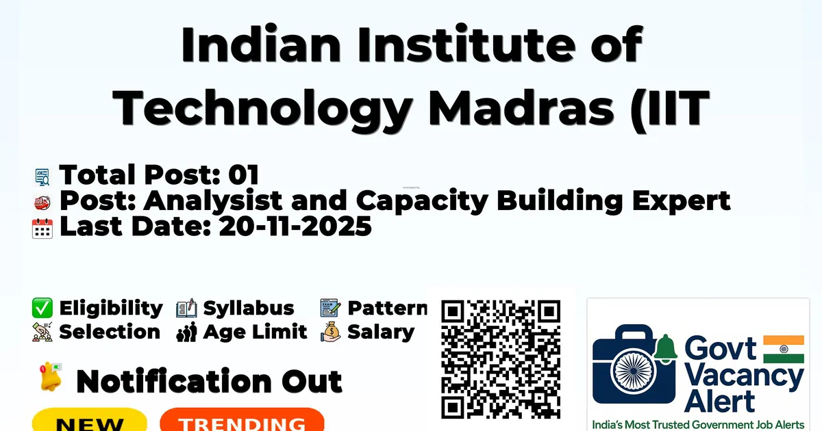 Indian Institute of Technology Madras (IIT Madras) has released an official notification for the recruitment of 01 Analysist and Capacity Building Expert Posts. Interested and eligible candidates can apply Online through the official IIT Madras website. The last date to submit the application form is 20-11-2025. In this article, you’ll find the IIT Madras Analysist and Capacity Building Expert Posts recruitment details, including eligibility criteria, age limit, salary structure, selection process, application steps, and direct links to the official notification and Online application form.