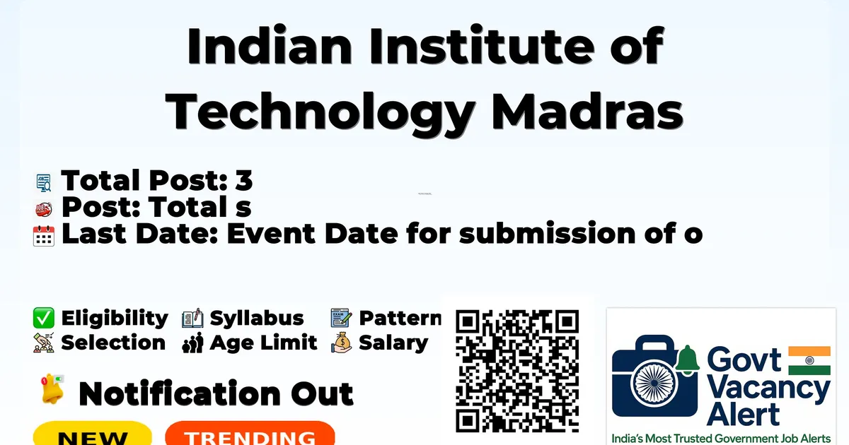 Company Name Indian Institute of Technology Madras Post Name Project Officer No of Posts 3 Advt No ICSR/PR/Advt.27/2026 Salary Up to Rs. 80,000 per month Qualification M.Tech/M.E Last Date to Apply 10-03-2026 Website https://www.iitm.ac.in