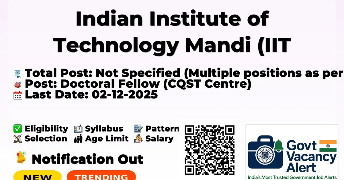 Indian Institute of Technology Mandi (IIT Mandi) has released an official notification for the recruitment of Post Doctoral Fellow Posts. Interested and eligible candidates can apply Offline through the official IIT Mandi website. The last date to submit the application form is 02-12-2025. In this article, you’ll find the IIT Mandi Post Doctoral Fellow Posts recruitment details, including eligibility criteria, age limit, salary structure, selection process, application steps, and direct links to the official notification and Offline application form.