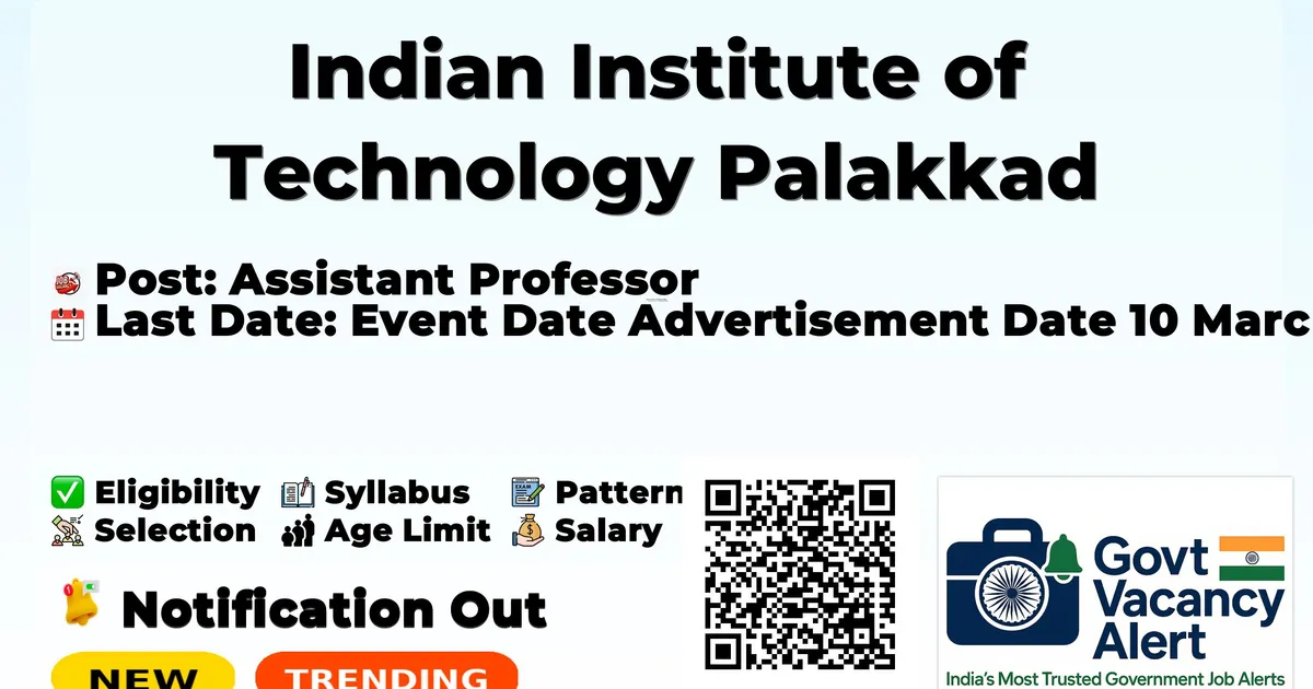 Indian Institute of Technology Palakkad (IIT Palakkad) has released an official notification for the recruitment of Assistant Professor Positions Posts. Interested and eligible candidates can apply Online through the official IIT Palakkad website. The last date to submit the application form is 09-04-2026.