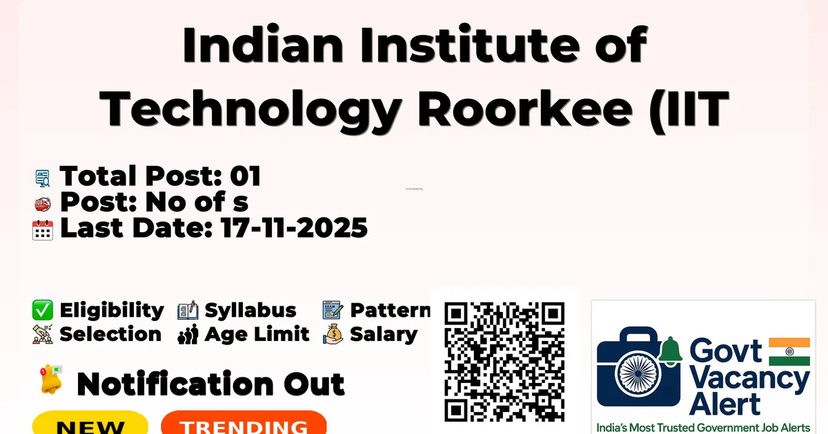 Indian Institute of Technology Roorkee (IIT Roorkee) has released an official notification for the recruitment of 01 Project Associate I Posts. Interested and eligible candidates can apply Offline through the official IIT Roorkee website. The last date to submit the application form is 17-11-2025. In this article, you’ll find the IIT Roorkee Project Associate I Posts recruitment details, including eligibility criteria, age limit, salary structure, selection process, application steps, and direct links to the official notification and Offline application form.