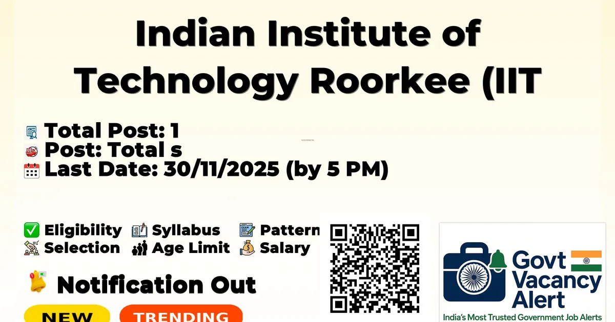 Indian Institute of Technology Roorkee (IIT Roorkee) has released an official notification for the recruitment of 01 Project Associate, Project Fellow and More Posts. Interested and eligible candidates can apply Offline through the official IIT Roorkee website. The last date to submit the application form is 30-11-2025. In this article, you’ll find the IIT Roorkee Project Associate, Project Fellow and More Posts recruitment details, including eligibility criteria, age limit, salary structure, selection process, application steps, and direct links to the official notification and Offline application form.