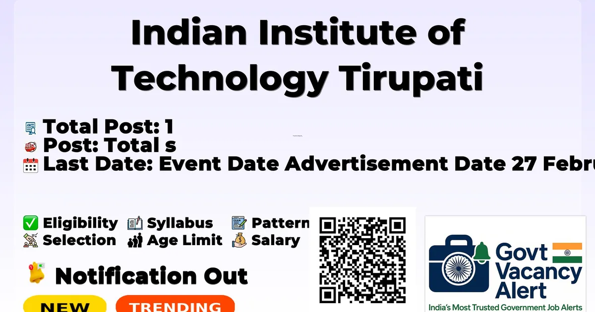 Indian Institute of Technology Tirupati (IIT Tirupati) Recruitment 2026: Indian Institute of Technology Tirupati has released the official notification for 1 Project Manager posts, inviting applications from eligible candidates in Andhra Pradesh. This recruitment provides an excellent opportunity for candidates seeking stable and well-paid education jobs. The last date to apply online is 13-03-2026, and candidates are strongly advised to complete their applications before the deadline. Below, you can find complete details of Project Manager Recruitment 2026, including vacancy breakdown, eligibility, age limit, salary, selection process, application procedure, and important links. Advertisement Company Name Indian Institute of Technology Tirupati Post Name Project Manager No of Posts 1 Advt No Advt/IITT/CSRC/25-26/38 Salary Rs. 50,000/- Per Month Qualification UG degree in Engineering or non-engineering PG degree with minimum 60% marks and 2 years experience, or M.E./M.Tech in Engineering with minimum 60% marks Age Limit Not more than 45 years Last Date 13-03-2026 Apply Mode Online Job Type Contract Trending Govt Jobs RRB 22000 Group D Online form 2026 IAF Agniveer New Recruitment 2026 DSSSB 911 AE, JE & More Online Form 2026 MCL 677 Various Vacancies Online Form 2026 MMRDA 235 AE, JE and More Posts Online Form 2026 Candidates who are interested in applying for the IIT Tirupati Recruitment 2026 should first download and carefully read the official notification PDF. The notification contains complete details about vacancy distribution, eligibility criteria, age limit, stipend/salary, selection process, important dates, and application instructions. Reading the official document is important to ensure that you meet all requirements before submitting the application form. Download IIT Tirupati Project Manager Job 2026 Notification PDF Post Name Total Posts Project Manager 1 Total 1 UG degree in Engineering or non-engineering PG degree with minimum 60% marks and 2 years experience M.E./M.Tech in Engineering with minimum 60% marks Relaxation: 5.5 CGPA or 55% for OBC/EWS Relaxation: 5.0 CGPA or 50% for SC/ST/PWD Desirable: Experience working in reputed institutions on sponsored and industrial projects Category Fee No application fee is mentioned in the official notification. Project Manager: Maximum age limit is 45 years. Consolidated Monthly Salary: Rs. 50,000/- Higher pay will be considered based on experience and expertise. Tenure: Initially for ONE year, renewable at discretion of Institute. Event Date Advertisement Date 27 February 2026 Application Last Date 13 March 2026 Shortlisted candidates will be called for offline interview at IIT Tirupati No TA/DA will be paid to candidates appearing for interview Interview date will be notified to shortlisted candidates by email Candidates who meet the eligibility criteria can apply online for the IIT Tirupati Project Manager Recruitment 2026. Applications must be submitted online on or before 13-03-2026. To apply directly, use the Apply Online link provided in the Important Links section. Alternatively, candidates may visit the official website of IIT Tirupati to complete the application. Fill out the application form carefully with correct personal, educational, and contact details. Upload required documents such as photograph, signature, and certificates in the prescribed format. Pay the application fee online, if applicable. Review all details carefully before submitting the form. Take a printout or save a copy of the submitted application for future reference. Official Notification PDF Click here Apply Online Click here Official Website Click here