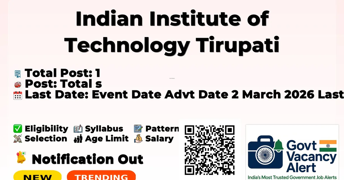 Indian Institute of Technology Tirupati (IIT Tirupati) Recruitment 2026: Indian Institute of Technology Tirupati has released the official notification for 1 Chief Manager posts, inviting applications from eligible candidates in Andhra Pradesh. This recruitment provides an excellent opportunity for candidates seeking stable and well-paid government jobs. The last date to apply online is 13-03-2026, and candidates are strongly advised to complete their applications before the deadline. Below, you can find complete details of Chief Manager Recruitment 2026, including vacancy breakdown, eligibility, age limit, salary, selection process, application procedure, and important links. Advertisement Company Name Indian Institute of Technology Tirupati Post Name Chief Manager No of Posts 1 Advt No Advt/ IITTC/SRRC/2025-26/39 Salary Rs. 1,20,000/- - Rs. 1,70,000/- Per Month Qualification Ph.D in Engineering / Science / Humanities / Management with 7 years relevant experience (or) M.Tech / M.E with 10 years relevant experience (or) B.Tech / B.E / master's degree in science / Humanities / Management with 12 years relevant experience. Age Limit Max: 65 years Last Date 13-03-2026 Apply Mode Online Job Type Contractual Trending Govt Jobs RRB 22000 Group D Online form 2026 IAF Agniveer New Recruitment 2026 DSSSB 911 AE, JE & More Online Form 2026 MCL 677 Various Vacancies Online Form 2026 MMRDA 235 AE, JE and More Posts Online Form 2026 Candidates who are interested in applying for the IIT Tirupati Recruitment 2026 should first download and carefully read the official notification PDF. The notification contains complete details about vacancy distribution, eligibility criteria, age limit, stipend/salary, selection process, important dates, and application instructions. Reading the official document is important to ensure that you meet all requirements before submitting the application form. Download IIT Tirupati Chief Manager Job 2026 Notification PDF Post Name Total Posts Chief Manager 1 Total 1 Ph.D in Engineering / Science / Humanities / Management with 7 years relevant experience. M.Tech / M.E with 10 years relevant experience. B.Tech / B.E / Master's degree in Science / Humanities / Management with 12 years relevant experience. Category Fee No application fee is mentioned in the official notification. Maximum Age Limit: 65 years. Age relaxation will be applicable as per the rules. Rs. 1,20,000/- to Rs. 1,70,000/- Per Month (consolidated) Event Date Advt Date 2 March 2026 Last Date for Application 13 March 2026 Shortlisting based on qualifications and experience Offline Interview Applications must be submitted online on or before 13-03-2026. To apply directly, use the Apply Online link provided in the Important Links section. Alternatively, candidates may visit the official website of IIT Tirupati to complete the application. Fill out the application form carefully with correct personal, educational, and contact details. Upload required documents such as photograph, signature, and certificates in the prescribed format. Pay the application fee online, if applicable. Review all details carefully before submitting the form. Take a printout or save a copy of the submitted application for future reference. Link Description Link Official Notification PDF Click here Apply Online Click here Official Website Click here
