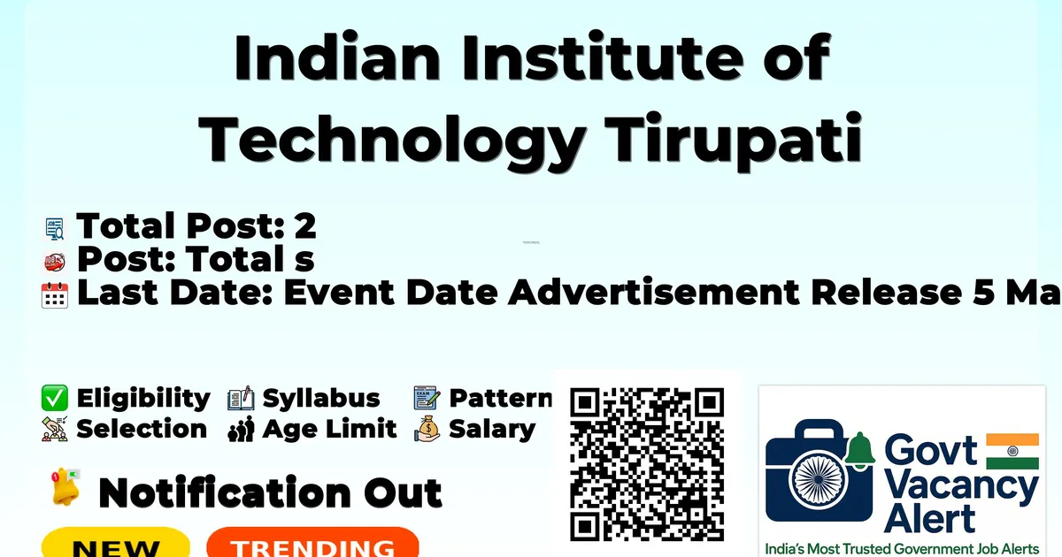 Indian Institute of Technology Tirupati (IIT Tirupati) has released an official notification for the recruitment of 2 Junior Executive Posts. Interested and eligible candidates can apply Online through the official IIT Tirupati website. The last date to submit the application form is 20-03-2026.