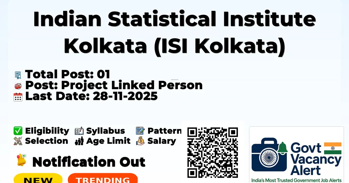 Indian Statistical Institute Kolkata (ISI Kolkata) has released an official notification for the recruitment of 01 Project Linked Person Posts. Interested and eligible candidates can apply Online through the official ISI Kolkata website. The last date to submit the application form is 28-11-2025. In this article, you’ll find the ISI Kolkata Project Linked Person Posts recruitment details, including eligibility criteria, age limit, salary structure, selection process, application steps, and direct links to the official notification and Online application form.